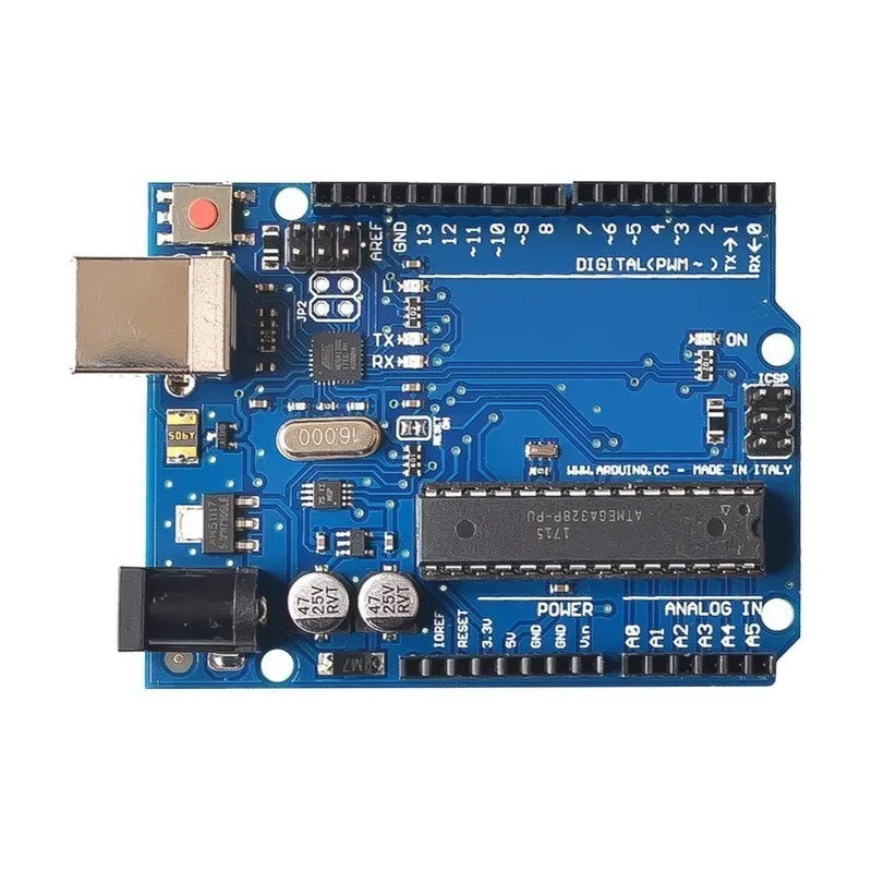 - لوحة أردوينو أونو Rev3 SMD هي لوحة متحكم دقيقة مبنية على ATmega328. تحتوي على 14 منفذ إدخال/إخراج رقمي (6 منها تُستخدم كمخرجات PWM)، و6 منافذ إدخال تناظرية، ومرنان سيراميكي بتردد 16 ميجاهرتز (CSTCE16M0V53-R0)، ومنفذ USB، ومقبس طاقة، وموصل ICSP، وزر إعادة ضبط. تحتوي على كل ما يلزم لدعم المتحكم الدقيق؛ ما عليك سوى توصيله بجهاز كمبيوتر باستخدام كابل USB أو تشغيله بمحول تيار متردد إلى مستمر أو بطارية للبدء.